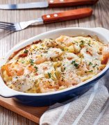 奶油味暗恋,奶油海鲜焗宽面 【材料】 义大利宽面100公克 虾仁100公克 鱼片100公克 蘑菇片60公克 洋葱丁10公克 【调 味 料】 盐1茶匙 橄榄油1大匙 黑胡椒粒少许 市售白酱200公克 【做法】 1.烧一锅水(约500CC),加入1茶匙盐,水开后将