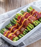 风起于青萍之末,芥末培根芦笋卷 【材料】 培根片4片 鲜芦笋300公克 【调 味 料】 黄芥末酱适量 白酒2大匙 【做法】 1.芦笋去掉根部较硬部分,再切成长约10公分的段;培根切成长约15公分段状,备用。 2.将培根舖平,放上适量芦笋