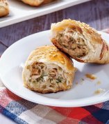 派派6.5.014,沙拉真鲨,沙拉鮪魚派 【材料】 水煮罐头鲔鱼180公克 起酥皮5张 洋葱末50公克 蛋黄1颗 白芝麻少许 【调 味 料】 美奶滋80公克 黑胡椒粉1/6茶匙 【做法】 1.鲔鱼罐头沥去水分后剥碎放入料理盆中,加入洋葱末、美奶滋、黑