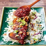 岳的胯香,思浓思雨,香浓芝麻酱 【材料】 A.芝麻酱70公克 花生酱20公克 姜泥10公克 蒜泥5公克 棉白糖10公克 白醋45公克 辣油6公克 B.水50cc 味醂25公克 酱油25公克 【做法】 1.将材料A的所有材料充分拌匀。 2.将材料B的所有材料放入锅中