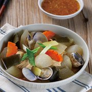 失守 焦糖冬瓜,苍穹之上焦糖冬瓜,豆皮昆布卤冬瓜 【材料】 豆皮卷50公克 昆布6公克 冬瓜700公克 红萝卜片40公克 蛤蜊150公克 姜片10公克 水900cc 【调 味 料】 米酒1大匙 酱油1/2大匙 盐1小匙 糖1小匙 【做法】 1.豆皮卷加入热水泡软,