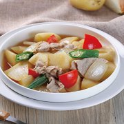洋小马哥起司马铃薯,葱卤马铃薯 【材料】 洋葱120公克 马铃薯600公克 番茄2颗 秋葵30公克 梅花肉片60公克 蒜末10公克 【调 味 料】 酱油1大匙 盐1/2小匙 糖1/2大匙 白胡椒粉少许 【做法】 1.洋葱去皮洗净切片;马铃薯洗净去皮切块;