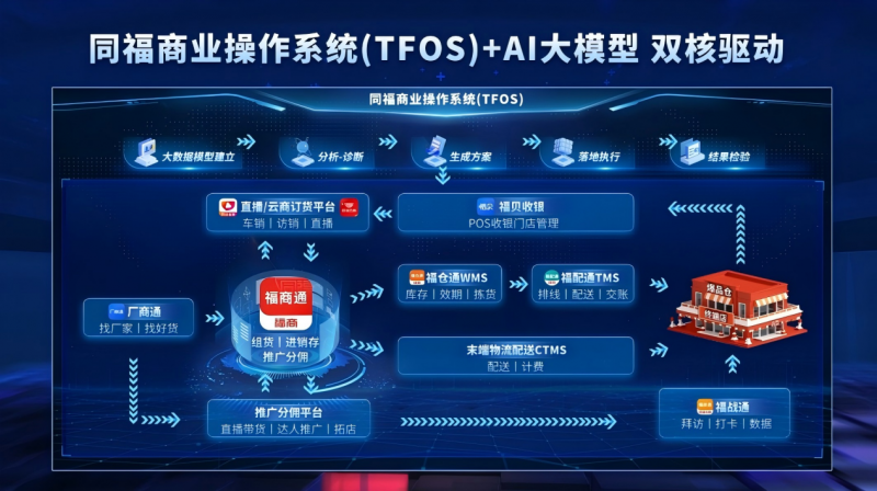 行动计划还强调“推动人工智能在批发零售、餐饮住宿等商业场景应用”,同福共享平台则以厂商通APP、同福云商、同福直播等七大自研科技产品,将这一部署渗透到县域商贸的“厂-商-店-客”全环节。