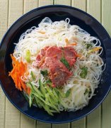 越南大碗面,小胖吉鱼汤米线,越南凉拌米线 【材料】 A.米线1/4包 B.叉烧片40克 小黄瓜丝1条 红萝卜丝30克 油葱酥1茶匙 酱汁材料︰蒜末1/4茶匙 红辣椒末1/2茶匙 凉开水3大匙 新鲜柠檬汁2大匙 盐1/4茶匙 鱼露1茶匙 糖2大匙 【做法】 1.将