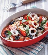 番茄滚蛋,大连鱿鱼哥,番茄罗勒烤鱿鱼 【材料】 透抽500公克 蒜片10公克 牛番茄400公克 醃渍黑橄榄50公克 萝勒叶5公克 【调 味 料】 盐1/2茶匙 黑胡椒粒1/4茶匙 白酒2大匙 橄榄油2大匙 【做法】 1.透抽去除内脏后洗净切圈;牛番茄切