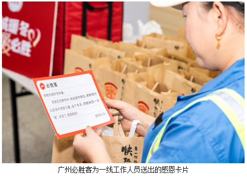 广州必胜客开展的“花城暖冬 有爱必胜”活动,则为百花路必胜客非遗主题餐厅所属街道的社区工作者、环卫工人送出了近百份“有爱必胜餐”,并在每份感恩餐中附上了感恩卡片:“感谢您在寒冬中,依旧坚守岗位,这个冬天,阿胜给您一点暖”。