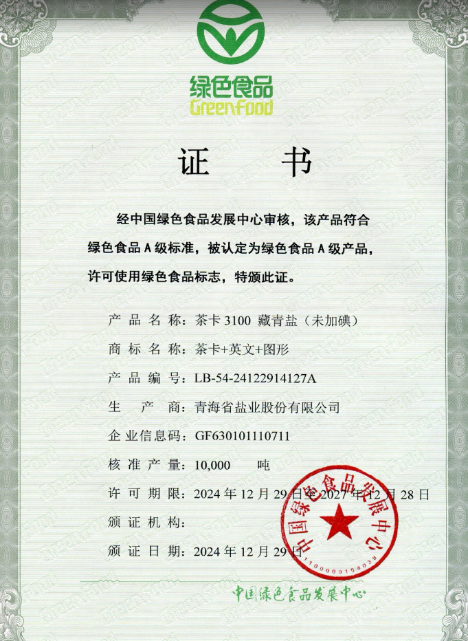 正因如此,“茶卡盐”被中国绿色食品发展中心认定为绿色食品A级产品,同时也是中国首个获得国家地理保护标志保护的盐产品。